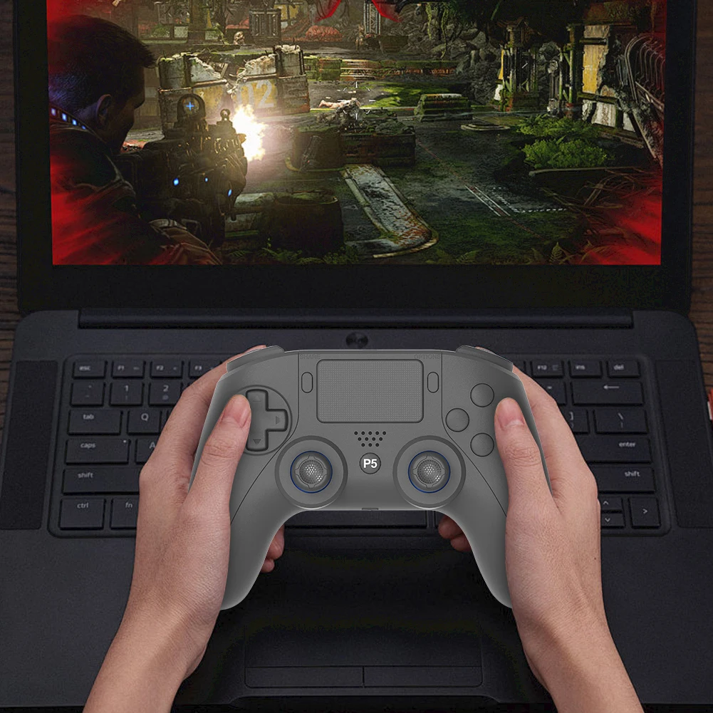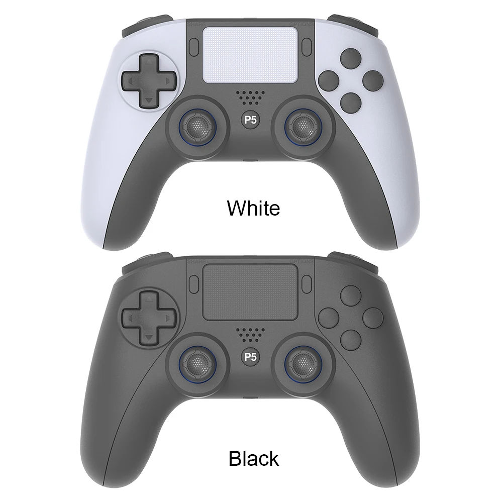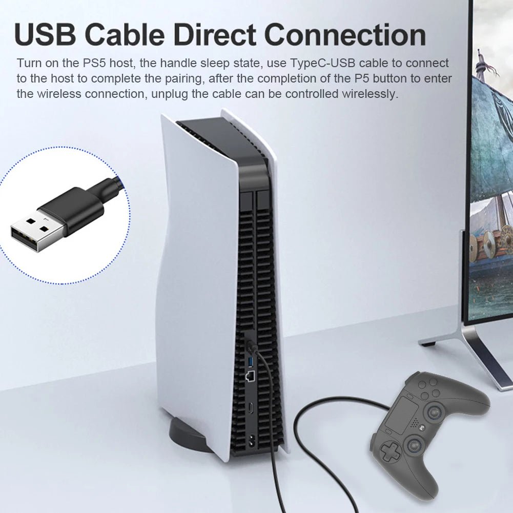 Feature: 1. Exclusive Wireless Design: The Gaming Controller retains all original DualSense features and is compatible with PS5 games. Connect via Bluetooth-Compatible to enjoy integrated speakers, dynamic sensors, Turbo, touch functions, and adaptive triggers for immersive gameplay. 2. Programmable Back Buttons: Customize your gaming experience with the Controller Gamepad's Mn button, which can be programmed to M1 and M2 keys. Easily clear functions by holding the Mn button and pressing the Remap key for personalized control. 3. Enhanced Vibration Motors: The Game Controller features powerful asymmetric vibration motors, providing a more immersive experience. Note: Vibration is not supported on PC. Feel every in-game action with increased realism and engagement. 4. Capture and Share Moments: With the Gamepad's share button, effortlessly capture and broadcast your gaming highlights and adventures to the world, sharing your exciting journey with friends and fellow gamers. 5. Seamless Bluetooth-Compatible Connectivity: The Game Gamepad offers wireless freedom with Bluetooth-Compatible connectivity, eliminating cable clutter. Use the built-in speaker or connect a headset via the 3.5mm jack for voice chat and enhanced interaction. Specification: Origin: Mainland China Applicable to: Compatible with PS5/PS5 Slim console/PC Color: White/Black (optional) Material: ABS Connection method: Bluetooth-Compatible Bluetooth-Compatible version: 4.0 Transmission distance: 10m Battery capacity: 600mAh Motion detector: Sensor six-axis motion gyroscope Audio: mono speaker, stereo headset jack Port: TYPE-C port, 3.5mm headphone jack Working current: 120mA±10mA Maximum current <300mA Packaging weight: 308g Product size: 150.00x110.00x45.00mm/5.91x4.33x1.77inch Connection steps Compatible with P5 host connection: Turn on the host, when the controller is in sleep mode, use the TypeC-USB cable to connect the host to complete the pairing. After completion, press the P5 button to enter the wireless connection, and unplug the cable for wireless control. PC computer connection: Connect the USB cable of the controller to the host and use it. Note: When using the audio function on the host Compatible with PS5 , the "USB cable" status must be set to on on the host, follow the steps of "Settings-Accessories-Controller-Connection" to check the use of USB cable