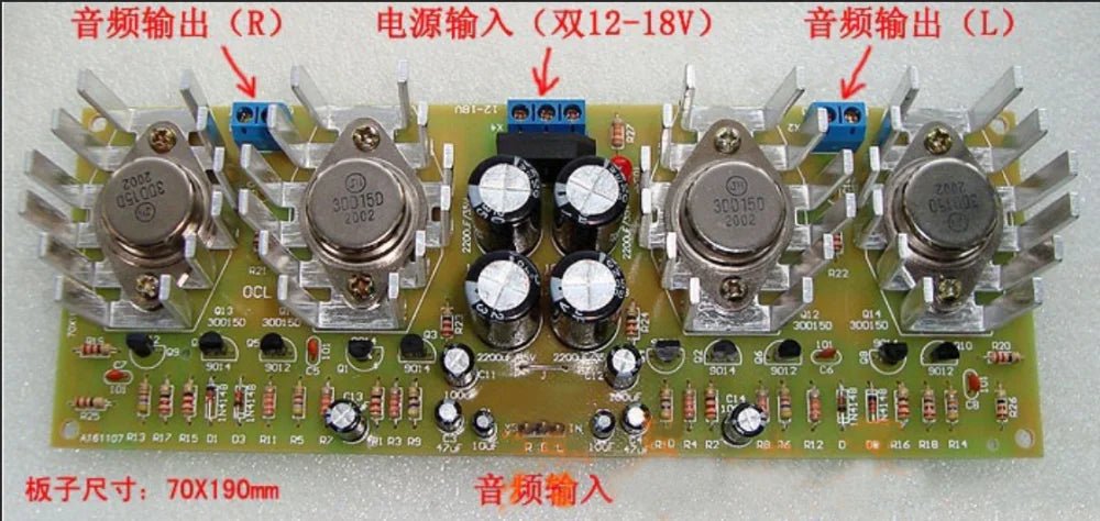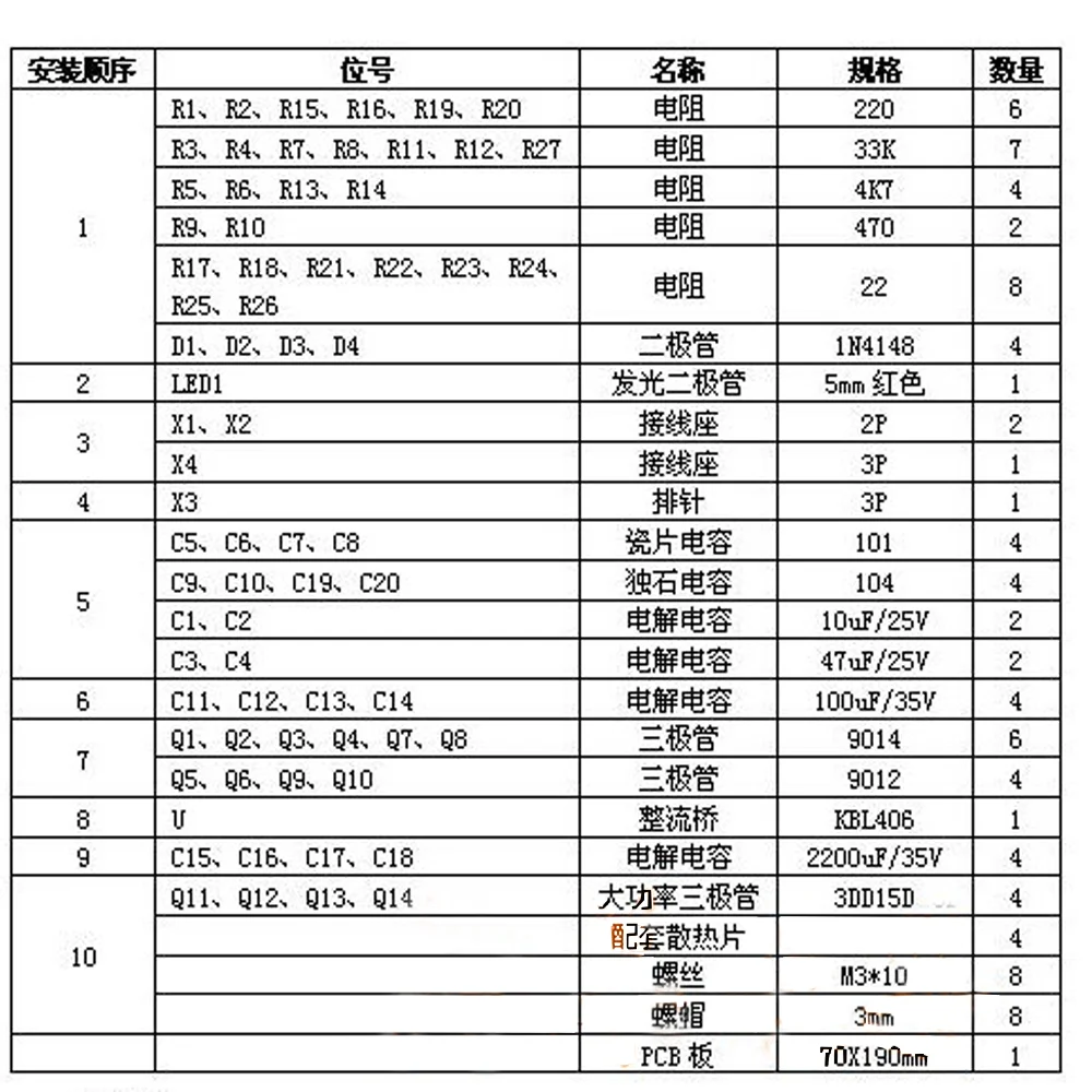 The OCL high-power amplifier kit is a typical OCL circuit. The circuit adopts direct coupling and has good low-frequency response; the input stage adopts differential amplification with low noise; the output stage adopts Darlington composite tube, which has high gain, high power and low distortion; This circuit is especially suitable for making home power amplifiers and power amplifier circuits for active speakers, and the effect is very good.