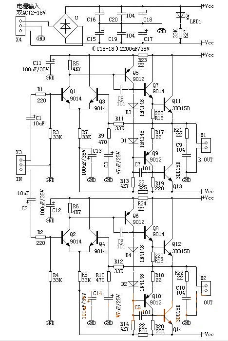 The OCL high-power amplifier kit is dual-channel, and the two-channel circuit principle is exactly the same. Take the right (R) channel as an example. In the circuit, Q1 and Q3 are the differential amplifier input stages, Q5 is the excitation stage, and Q7 and Q11, Q7 and Q11 constitutes a composite complementary output stage. The output signal is taken out from the Q11 emitter and Q13 collector. The output audio signal can directly drive the loudspeaker to emit a loud sound. This circuit also adds R25, R27, C11, C13 to reduce static noise.