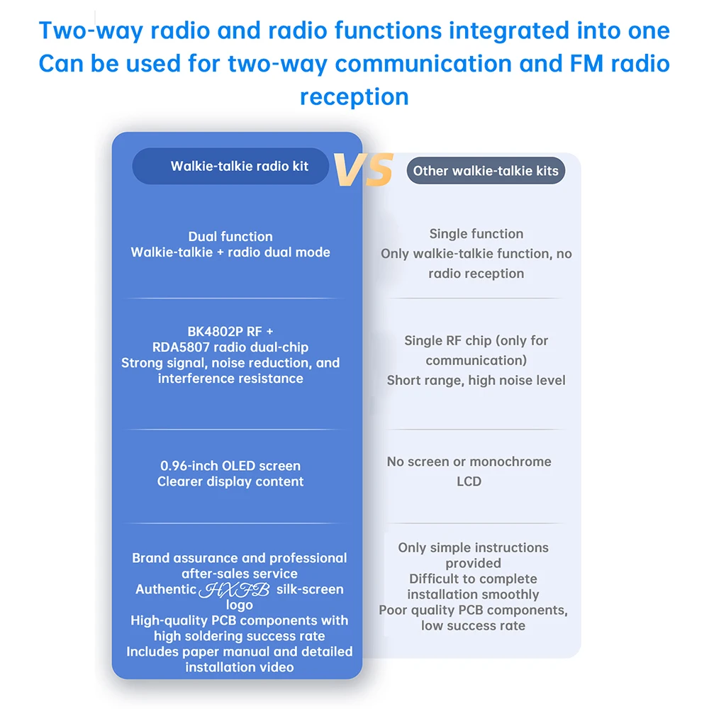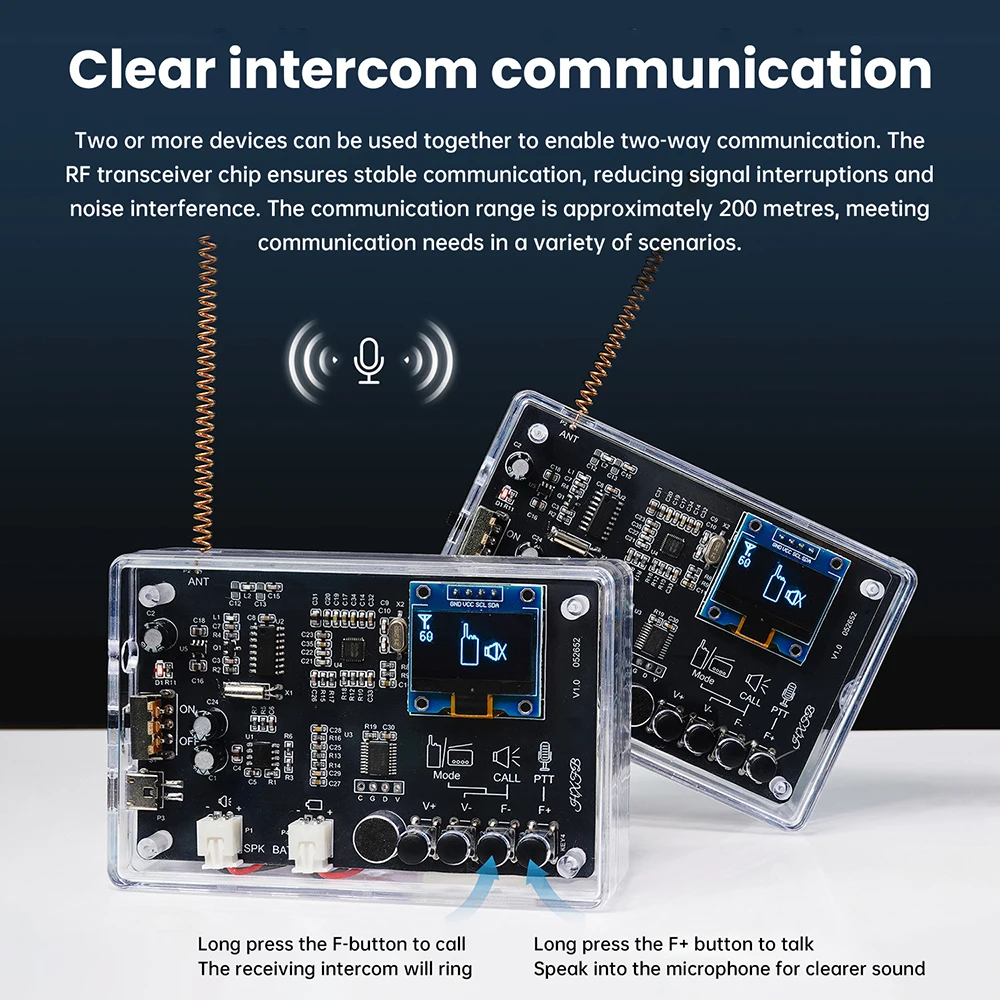The smart walkie-talkie radio kit combines walkie-talkie and radio functions, meeting your dual needs for wireless communication and radio listening. Two walkie-talkie units form a pair; a single unit can be used as a radio but cannot function as a walkie-talkie. It is recommended to purchase a pair. Utilizing RF transceiver chips for clear and distinguishable voice quality, the walkie-talkie operates on the 409.85MHz frequency band with a communication range of approximately 200 meters, suitable for various communication scenarios. Equipped with an 87-108MHz frequency band radio function, it features low noise, strong anti-interference capability, automatic station search and storage, and user-friendly operation.