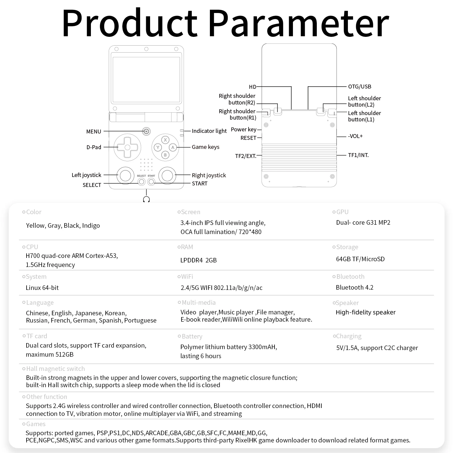 Introducing the ANBERNIC RG34XXSP Linux Portable Game Classic Games Retro Player Handle - the ultimate handheld game console for gaming enthusiasts! Enjoy an immersive gaming experience on the go with its 3.5-inch IPS full viewing angle and OCA full lamination that delivers crystal-clear visuals at a resolution of 720*480.
